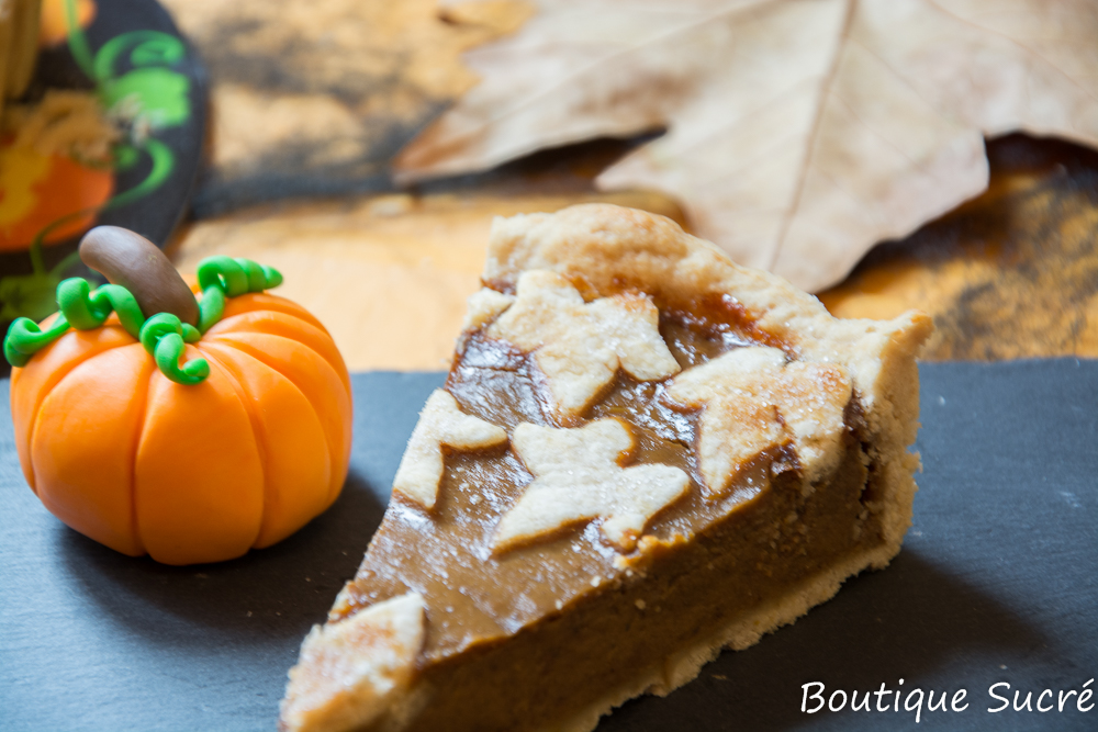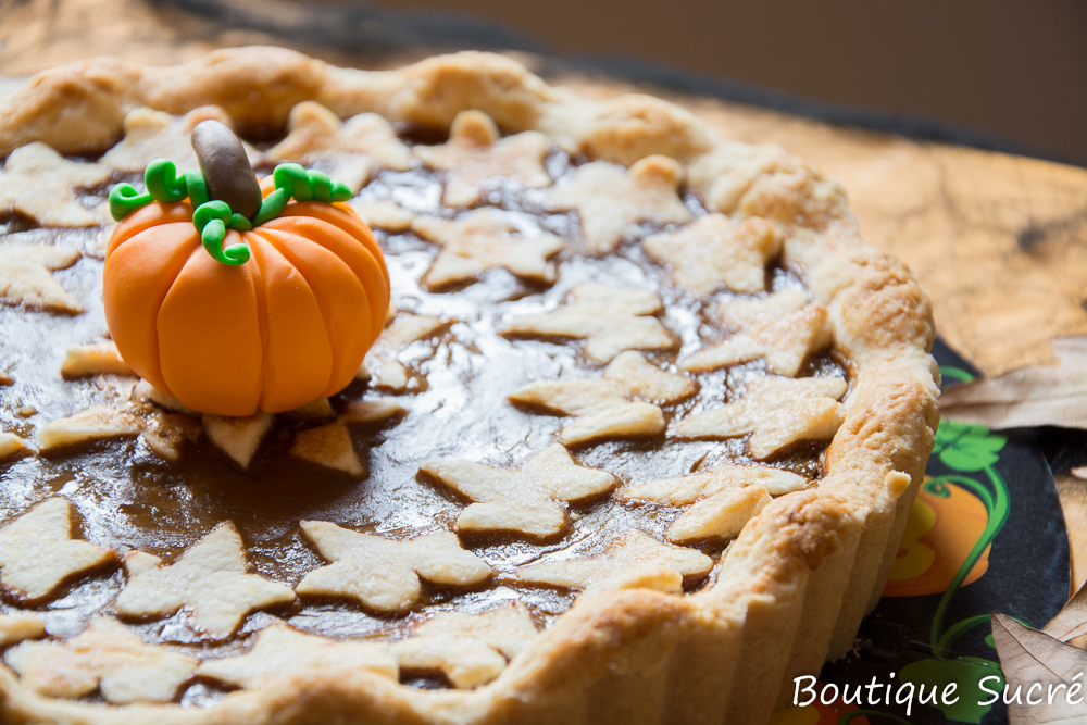 -Extiende el disco de masa mas pequeño sobre la mesa de trabajo y con un cortador de galletas en forma de hoja de Arce, haz varias hojas y disponlas arriba del relleno para decorar a modo de cubierta.
