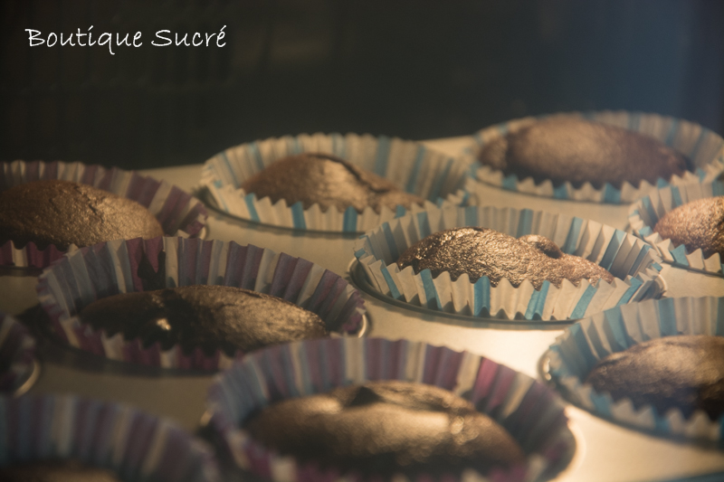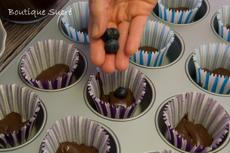 -Vierte un poco de la mezcla en los capacillos o capsulas, luego coloca arándanos y una pastilla de chocolate Negro con Arándanos Azules en el centro de cada capacillo.