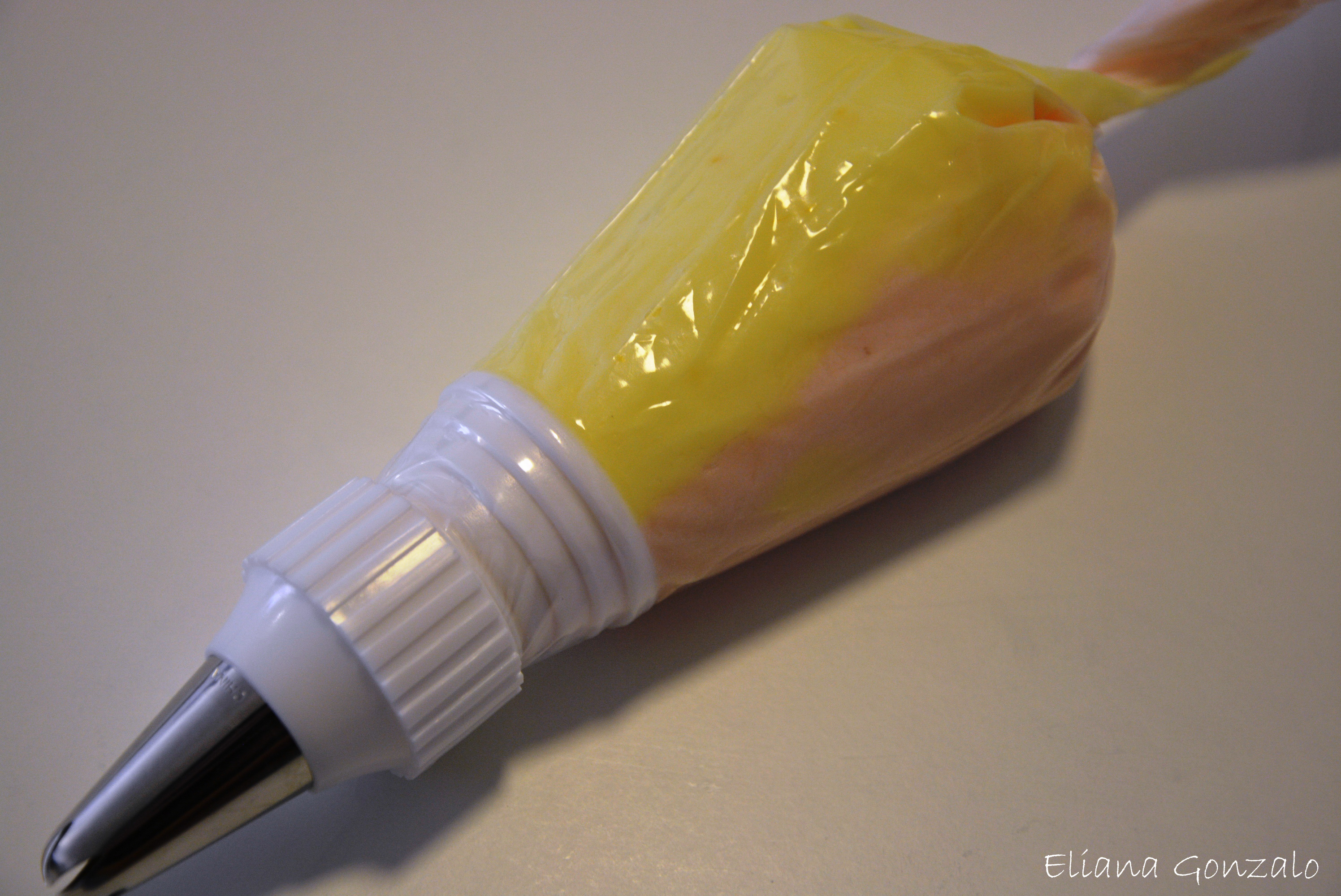 -A un lado de la manga untar un poco de crema de limón y al otro lado un poco de crema de fresa. Deja salir un poco de crema hasta que comience a salir bicolor. Y listo decóralos como prefieras. Yo los decoré de afuera hacia adentro como se aprecia en las fotografías.