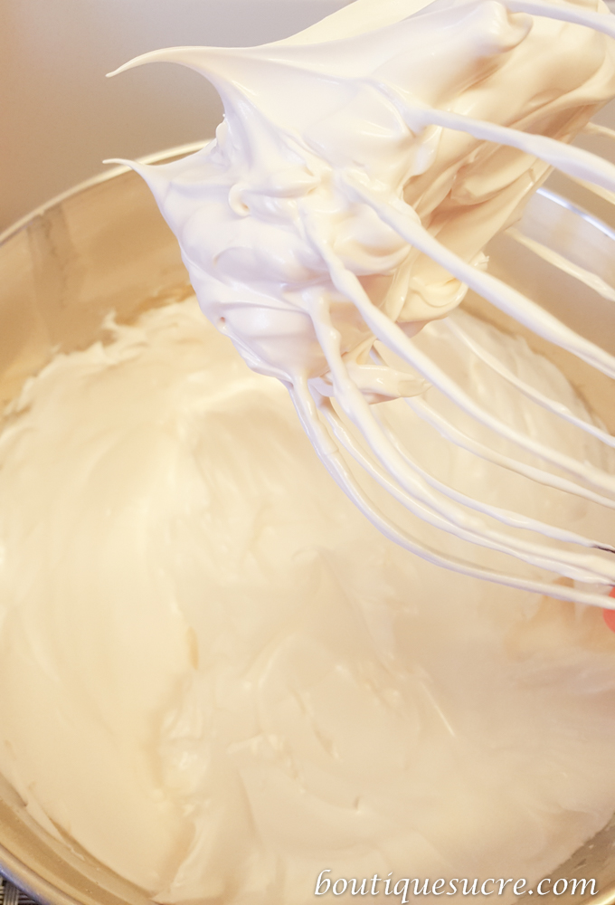 -En el bowl de la batidora eléctrica calienta al baño maría las claras y el azúcar hasta llegar a 55ºC. Retira el bowl y monta las claras con la batidora eléctrica a velocidad media- alta unos seis a siete minutos o hasta que el Bowl este templado. Añade la vainilla mientras esta en funcionamiento la Batidora.