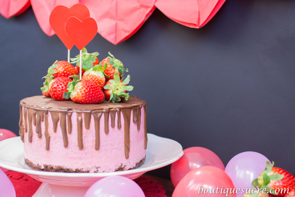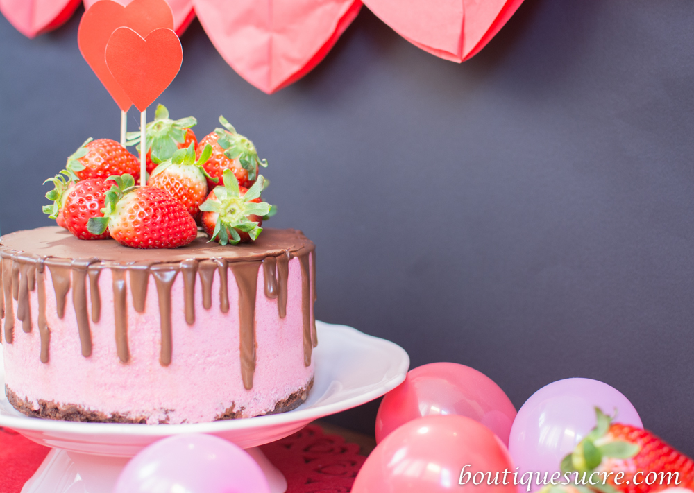 -Vierte la Mousse de Fresas sobre el bizcocho de Chocolate. Mete nuevamente el molde al congelador por unas cuatro horas.