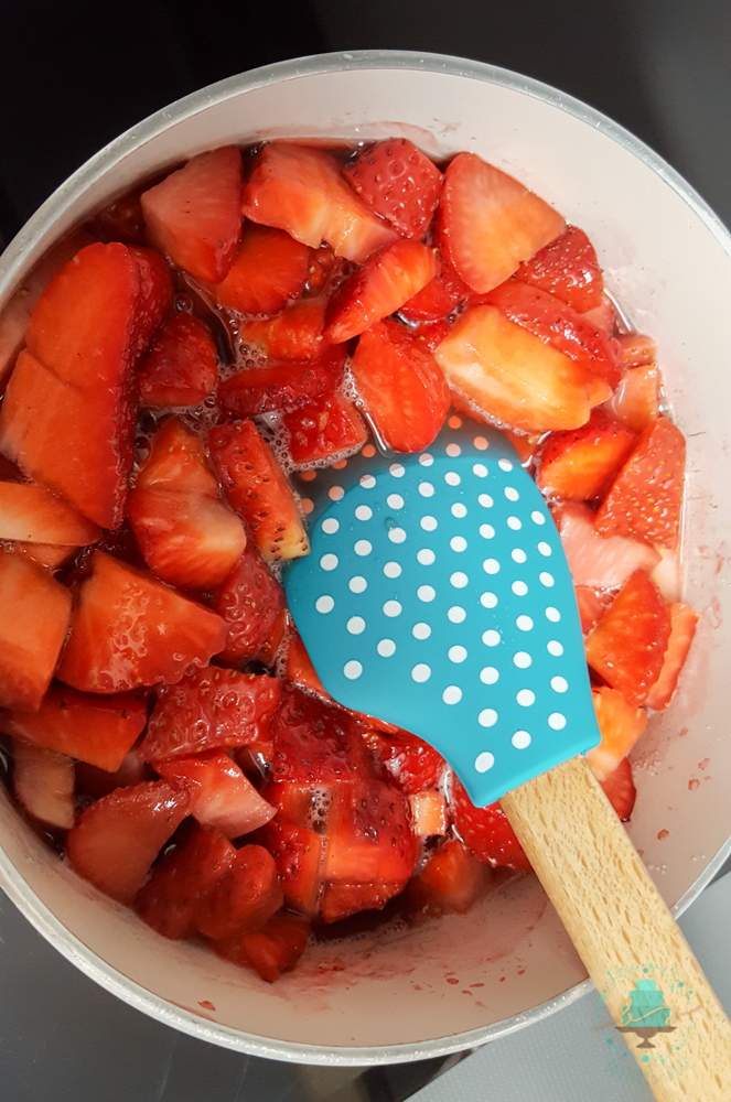 -En un Cazo coloca 5oo gramos de las Fresas ya cortadas junto al azúcar y la 1/2 taza de agua, calienta a fuego medio por 15 minutos. Los otros 500 gramos de Fresas frescas córtalas en trozos pequeños y reserva.
