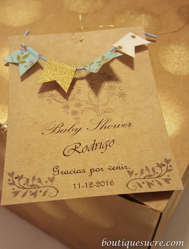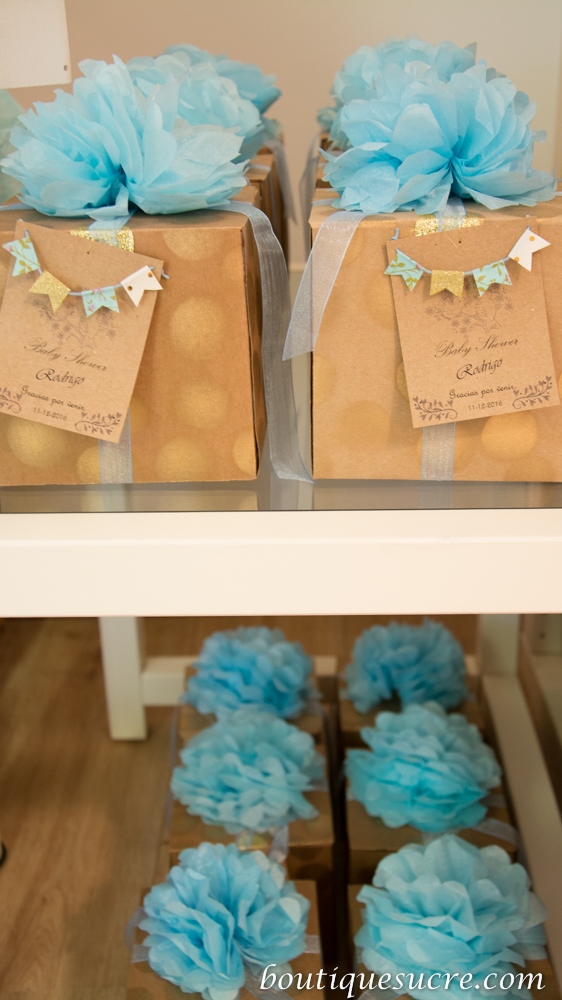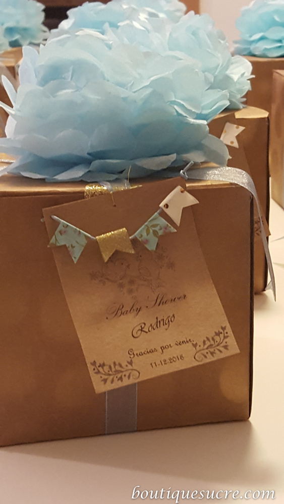 Recuerditos del baby Shower para cada una de las invitadas. Podéis hacer todo por vosotros mismos(as) como en este caso, las cajas las he hecho totalmente a mano con patrones, pinturas y plantillas para así dibujarle los circulos. Los pompones azules hechos con papel seda y las tarjetas hechas en programas como PowerPoint en el ordenador e impresas en Cartulinas Kraft.