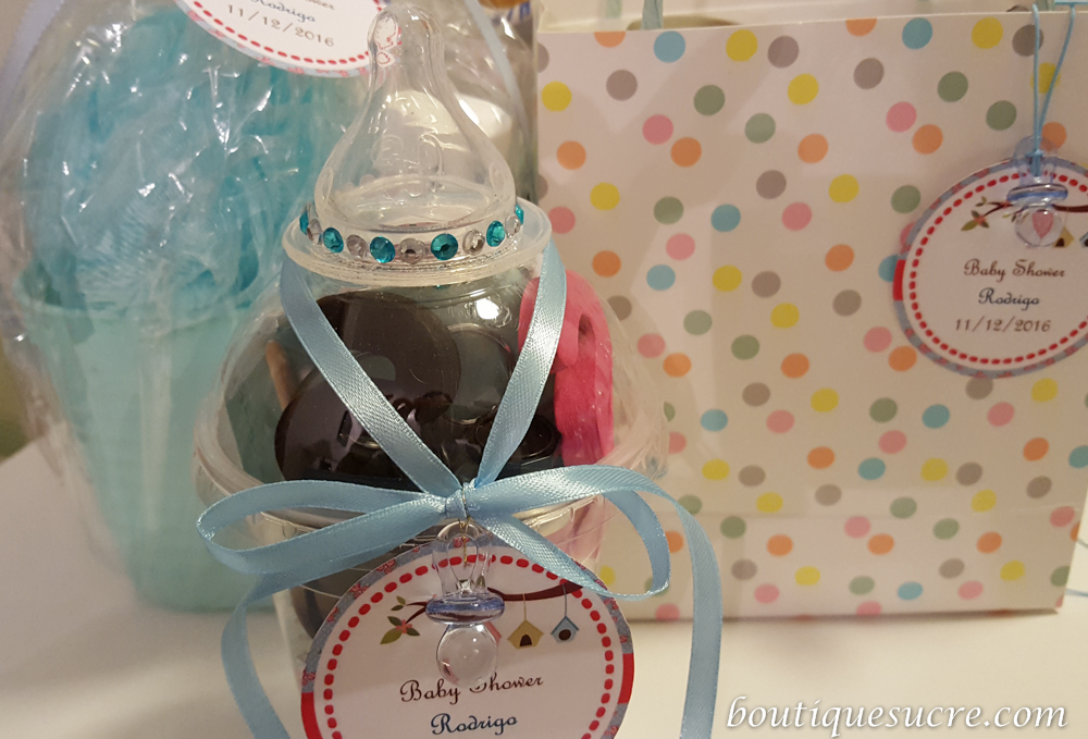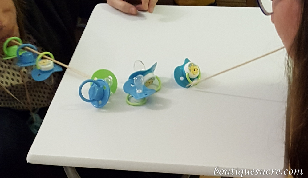 Como Bienvenida a las invitadas se les entregaba este colgante que es un chupete azul, y el de la Madre Agasajada era de color dorado. Este chupete también formaría parte de un juego a lo largo de la Fiesta.