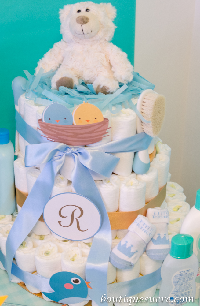 Tarta de pañales. Todo Baby Shower en regla debe tener una Tarta de Pañales, siendo este uno de los regalos para el futuro Bebé, con productos de higiene personal para su baño y cuidado. Hoy día hay muchos modelos, en formas de globo, de moto, de cochecitos pero lo mas clásico es una tarta de varios pisos como la de la foto.
