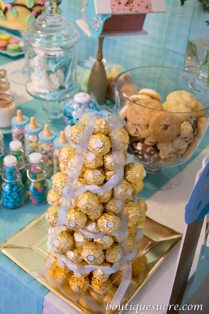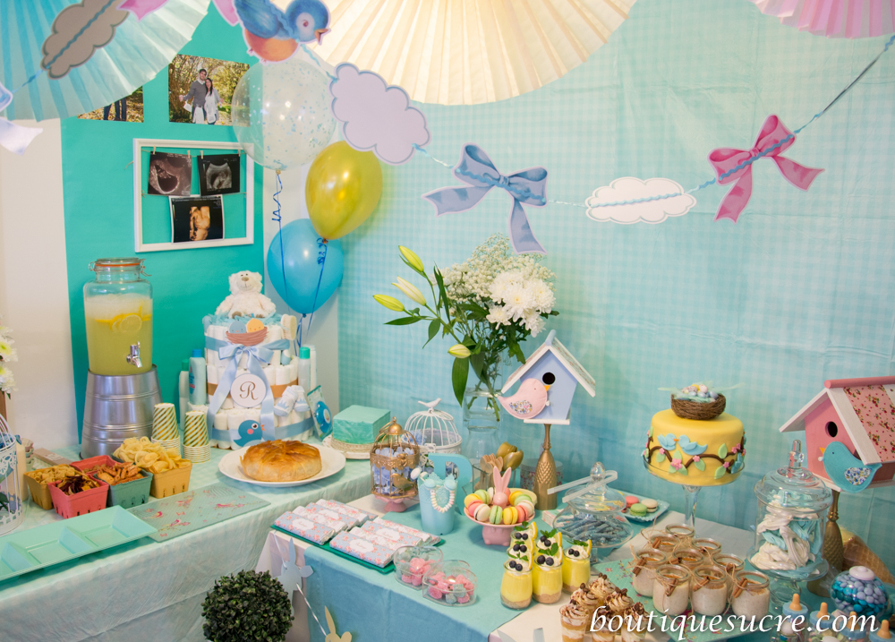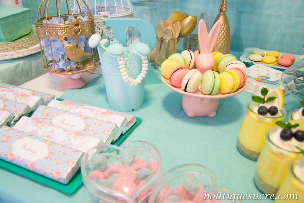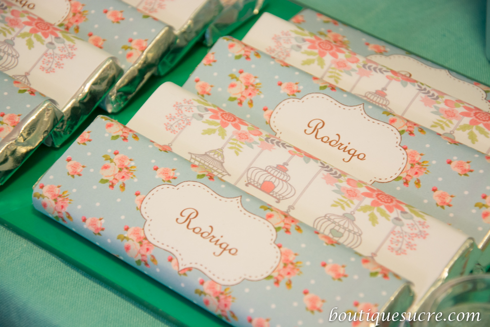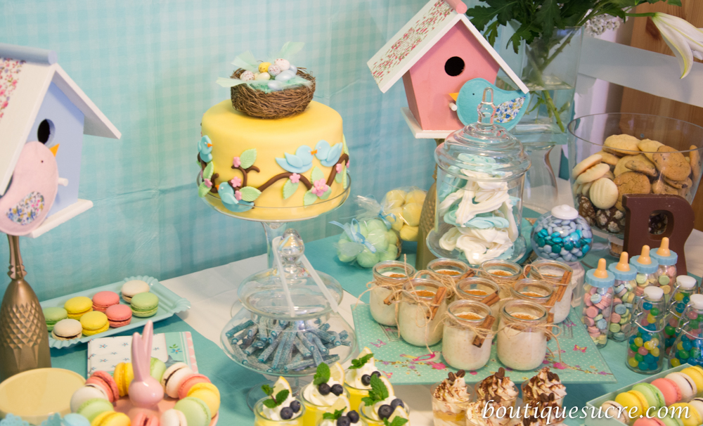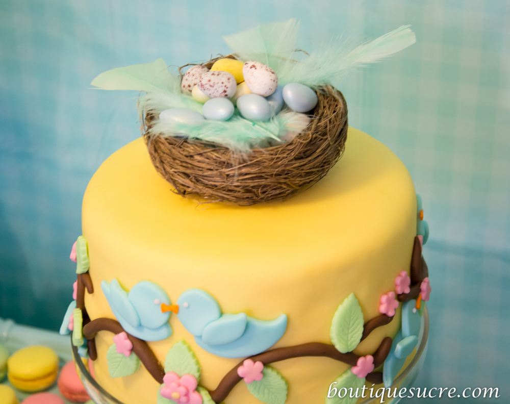 La Tarta. Elemento importante en un Candy bar. Hecha en tonos pastel, con Ramas de Arboles, Flores, y Pajaritos que son el tema principal del Baby Shower, coronando la Tarta un nido de Pajaros con plumas y huevos ( que son almendras recubiertas de chocolate totalmente comestibles) simbolizando el pronto nacimiento de Rodrigo.
