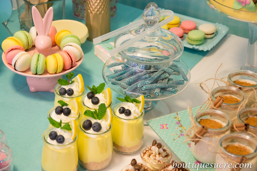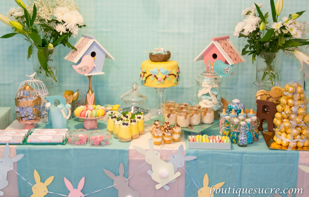 La Mesa Dulce con su guirnalda de Conejitos totalmente hecha a mano (muy sencilla de hacer). Imprimid una imagen de Conejito tamaño mediano y recortáis cartulinas de colores pastel. Luego pegáis una mota de algodón como rabito del conejo y abrís unos agujeros para pasar la cuerda que los una y con la que podáis amarrar a la mesa la guirnalda. Las Casitas de Pajaritos las he comprado en madera natural y con pintura Chalk Paint y Telas adhesivas las decore a mi gusto. Pajaritos hechos en tela, Jaulas, flores blancas, una preciosa torre de Chocolates Ferreros, la tarta y cada uno de los dulces le aportaron un aire fresco y tierno a este maravilloso Candy Bar.