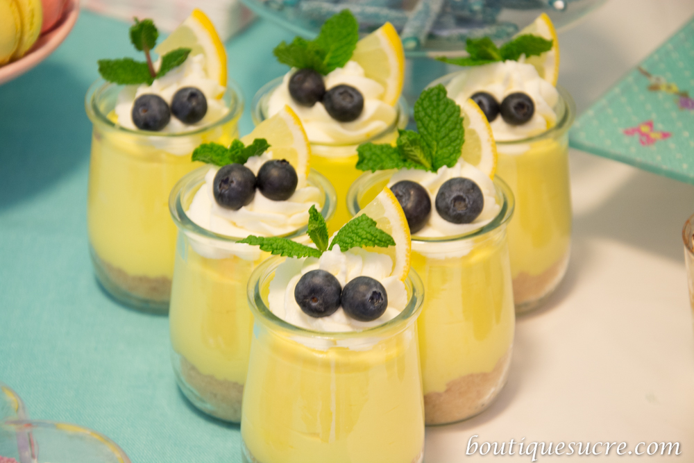 Vasitos de Mousse Cheesecake de limón. Con su base de Galletas trituradas, coronadas con Nata, Arándanos, Hierbabuena y Limón.