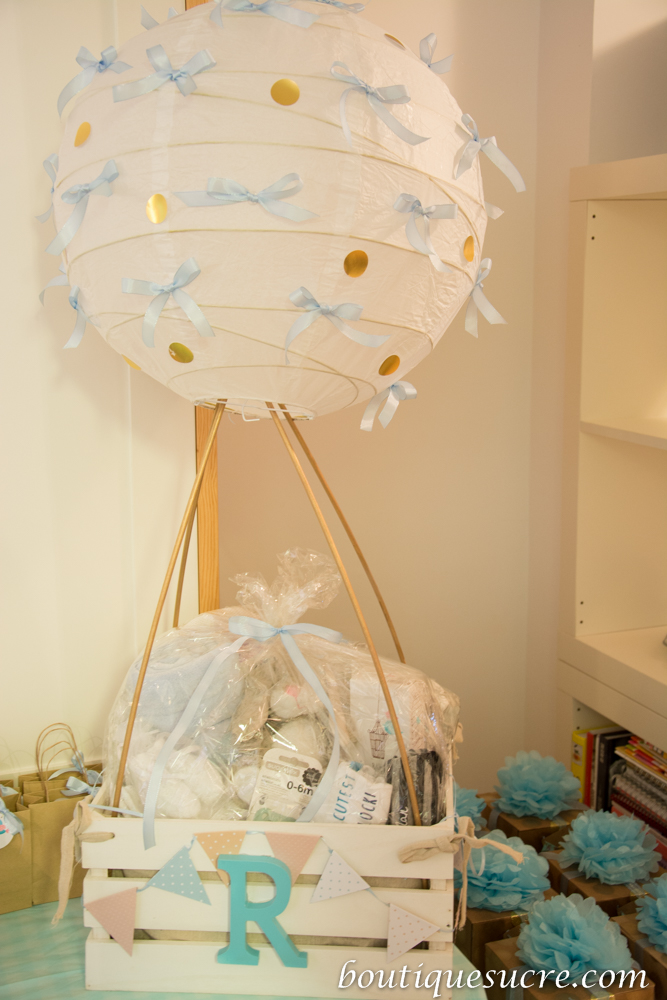 Uno de los regalos Para Rodrigo. Con la cesta del globo personalizada con la inicial del nombre del bebé.
