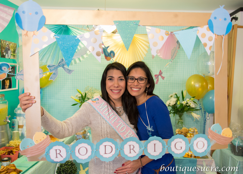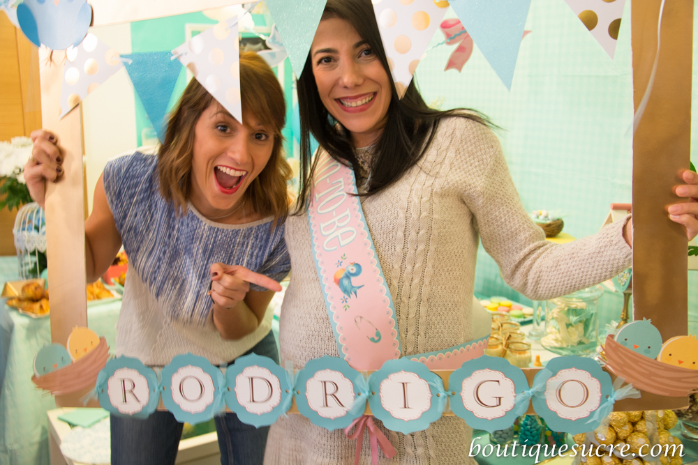 Photocall: para Hacer fotos divertidas con todas las invitadas hice un marco de Photocall con cartón, pintura en Spray dorada, banderines y Pajaritos hechos con cartulinas y cintas, además de un banderín hecho de Cartulina y tul Azul con el nombre del Bebé.