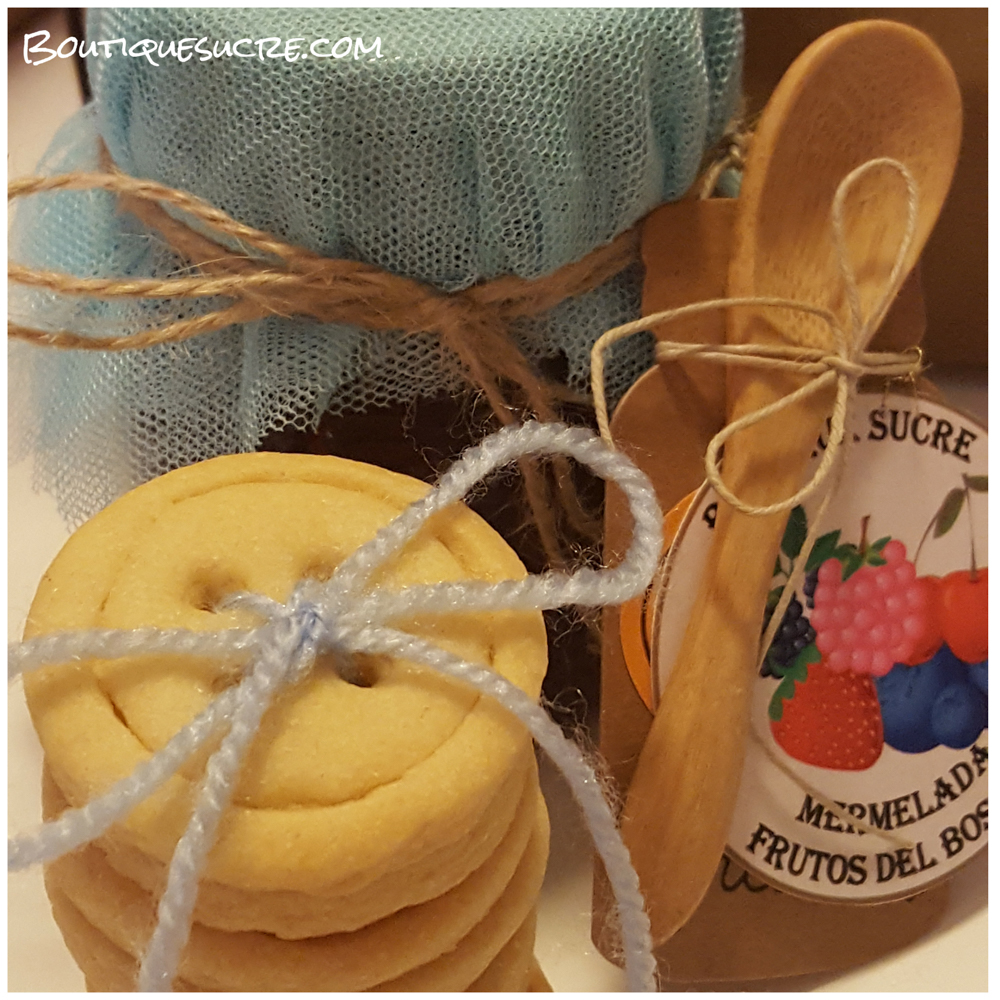 Cada Caja contenía una Mermelada o Lemon Curd Casero y una torre de Botones de Galletas de Mantequilla atadas con una cuerda.