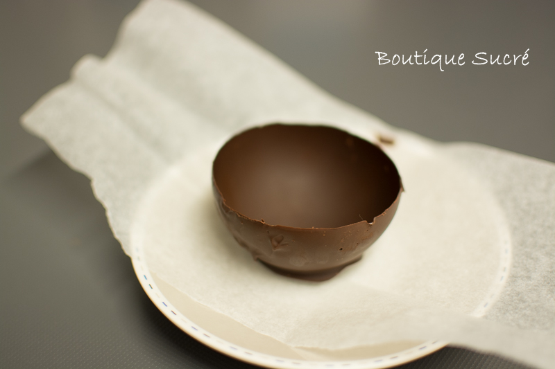 -Desinfla el globo cortándolo con unas tijeras y retíralo con cuidado de no romper la semiesfera de chocolate.