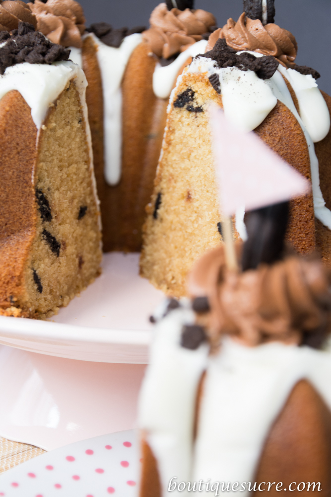 -Monta una manga pastelera de Buttercream con una boquilla 1M y realiza rosetones alrededor del Bundt. Coloca una galleta mini Oreo en cada rosetón de Buttercream y listo.