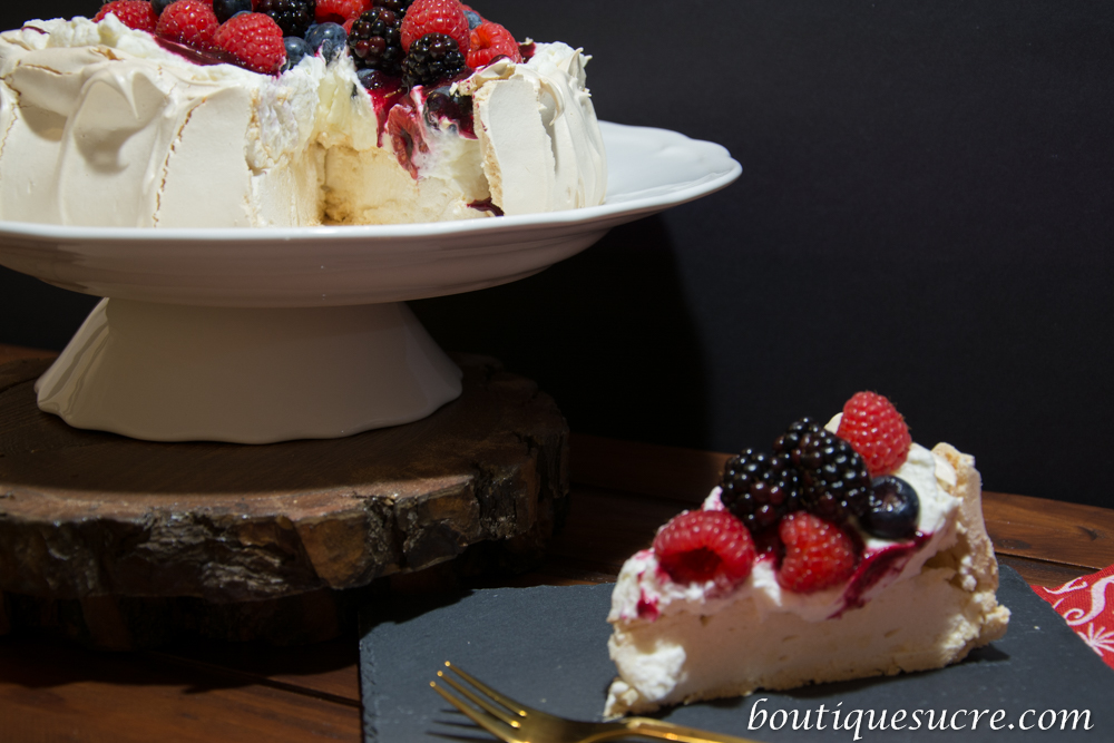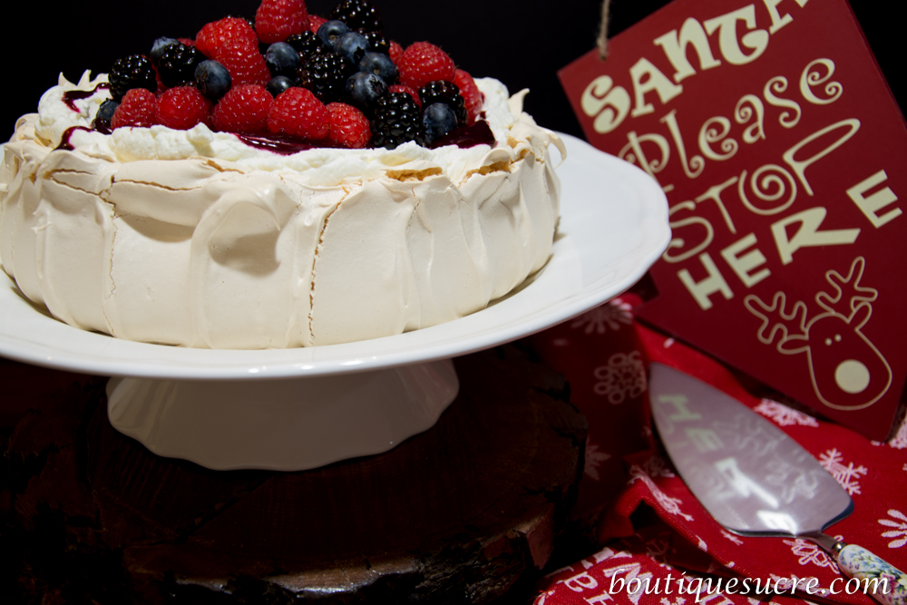 -Al enfriarse la Pavlova decórala con la Nata, el coulis y encima los frutos del bosque.